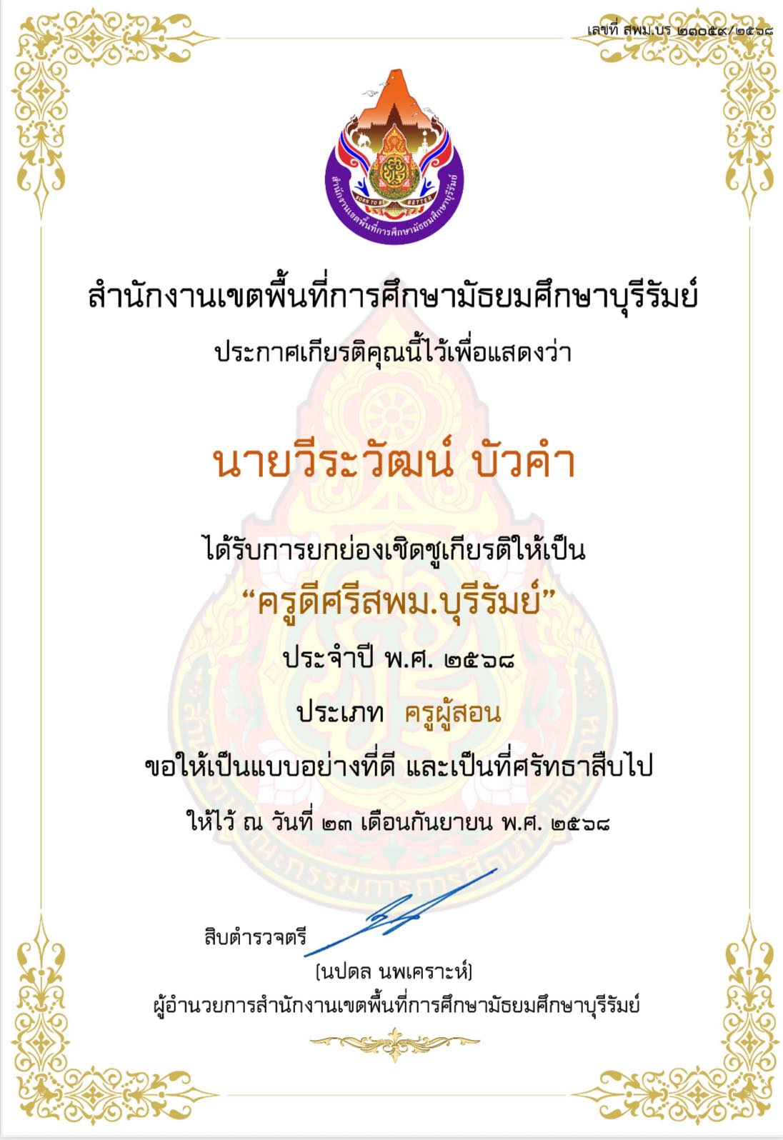 รางวัลครูดีศรี สพม.บุรีรัมย์ ตุลาคม 29, 2025ตุลาคม 29, 2025author_06 author_06รางวัลเกียรติยศ นายวีระวัฒน์ บัวคำ รางวัล ครูดี ศรีสพม.บุรีรัมย์ Powered By EmbedPress